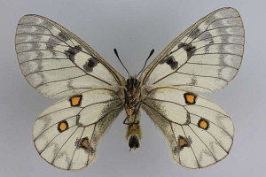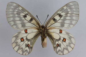 Lukhtanov et al. (2019: 15) erklären: "We found and analyzed the following three syntypes of Doritis clarius Eversmann, 1843 preserved in the collection of the Zoological Institute, Russian Academy of Sciences, St. Petersburg: (1) male, labelled: “coll Eversmann” (printed), “clarius ♂” (handwritten), “clarius Eversmann | 1843 Lectotypus ♂ | Kreuzberg design. | 12.09.1989” (red paper, handwritten), “Tarbagatei” (broken label with a handwritten inscription), “Zoological Institute | St. Petersburg | INS_LEP_0000666” (printed) (Fig. 1); (2) female, labelled “coll Eversmann” (printed), “clarius Eversmann | 1843 Paralectotypus | ♀ Kreuzberg design. | 12.09.1989” (red paper, handwritten), “Tarbagatei” (handwritten), and (3) male, labelled “Tarbagatei” (handwritten), “Колл. Вел. Князя | Николая | Михаиловича.” [in Russian. Translation: “coll. Grand Duke Nikolai Mikhailovich] (printed), “clarius Eversmann 1843 Paralectotypus | ♂ Kreuzberg design. | 12.09.1989” (red paper, handwritten). The first specimen bears the lectotype label made by late A.V.-A. Kreuzberg (1956–2012), a well-known expert in Palaearctic Papilionidae. However, this lectotype designation is unavailable according to Art. 11.1 because it has not been published. In the interest of taxonomic stability, we hereby formally designate this specimen (catalogue number INS_LEP_0000666, preserved in the collection of the Zoological Institute, Russian Academy of Sciences, St. Petersburg) as the lectotype of Doritis clarius Eversmann, 1843; it also becomes lectotype of Doritis ariadne Lederer, 1853 according to Art. 72.7 (Fig. 1)."