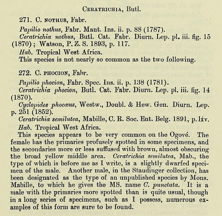 - Erstbeschreibung: Holland, W. J. (1896): A Preliminary Revision and Synonymic Catalogue of the Hesperiidae of Africa and the adjacent Islands, with Descriptions of some apperently new Species. — Proceedings of the General Meetings for Scientific Business of the Zoological Society of London for the Year 1896: 2-107, pl. I-V. — Digitalisat auf biodiversitylibrary.org: [79]