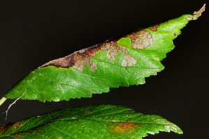 Gänsefuß (Chenopodium) und Melde (Atriplex) wurden schon bei Rößler ([1867]: 270) genannt - ob erstmals ist mir noch unklar. Möglicherweise liegt hier ein Fehler vor, der in den nächsten 150 Jahren immer wieder unkritisch abgeschrieben wurde. So ist bei Bau (1886) zu lesen: "Raupe im Frühjahr in zusammengesponnenen Brennnessel-, Hopfen- und Meldenblättern.", bei Eckstein (1933) dann: "Urtica, Chenopodium, Atriplex, Spiraea, Humulus, Ribes" und bei Slamka (2013): "The larva lives 6 and 8-5 in rolled-up leaves mainly of Urtica dioica also Humulus spp., Chenopodium spp., Atriplex spp., Filipendula ulmaria, Ribes spp."