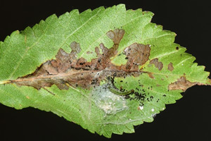 Keine weitere Berücksichtigung in der Literatur oder auf Internetseiten gefunden hatte eine Angabe von Peyerimhoff (1882) von Ulme: "Chenille [...] abonde en mai et en juin sur les orties, d'ou elle gagne parfois les basses branches des ormes et des autres plantes voisin." Wenn also im Frühjahr ein tief hängender Ulmen-Zweig in die vielen besiedelten Brennnesseln hineinhängt, werden Ulmenblätter mit in das Gespinst einbezogen, genauso wie Blätter anderer Pflanzen neben den Brennnesseln; fressen dürften die Raupen die Ulmenblätter dann durchaus können. Und tatsächlich konnte Josef Bücker [[Forumsbeitrag 17. September 2017]] unter dem Betreff "Patania ruralis an Ulmus minor" berichten: "hier ein Fund, der bestätigt, dass die Raupe des Nesselzünslers auch an Ulmen lebt. [...]" (siehe auch "Fraßspuren und Befallsbild", Bilder 6-7). Gezeigt wurde dann nicht eine ausgewachsene Raupe, die auch mal an einem Ulmenblatt nagt, sondern eine noch jüngere Raupe mit dem entsprechenden Fraßbild an einem Feld-Ulmen-Blatt - sehr wahrscheinlich hatte hier bereits die Eiablage stattgefunden.