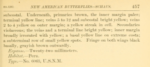 - Erstbeschreibung: Schaus, W. (1902): Descriptions of new American butterflies. — Proceedings of the United States National Museum 24: 383-460. — Digitalisat auf biodiversitylibrary.org: [456]