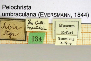 Nedoshivina (2007: 112-113): “Types. Lectotype ♂ (here designated) (Fig. 5): ‘Spask’ <handwritten>, ‘126c’ <handwritten>, ‘Praep. | micr. | N 9213 ♂ | Pseudoeucosma | umbraculana | Ev. ’ <handwritten>, ‘Praep. micr. N 0042 | Pelochrista umbraculana | (Eversmann, 1844) | S. Nedoshivina det., 2006’ <white, printed>, ‘LECTOTYPUS. | Teras umbraculana Ev., 1844. | S. Nedoshivina design. 2007’ <red, printed>. – Paralectotypes: 2 specimens without abdomen from Spassk (‘Spask’).”