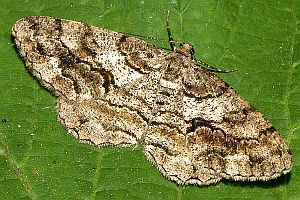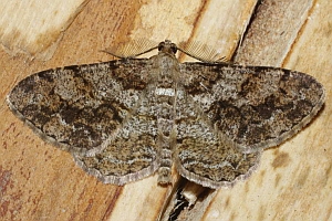 Peribatodes rhomboidaria (links): Äußere Querlinie vor dem Vorderrand mit scharfem "S" (am linken Flügel nachgezogen), vor dem Hinterrand mit flachem Bogen (rechter Flügel).
