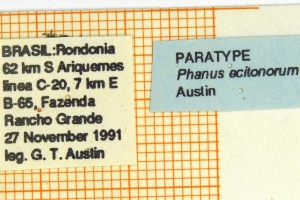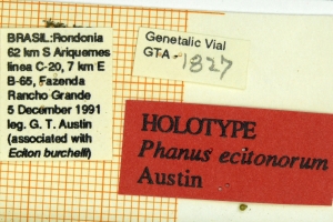 Austin (1993: 23): “Holotype ♂: with the following labels: white, printed - BRASIL: Rondonia / 62 km S Ariquemes / linea C-20, 7 km E / B-65, Fazenda / Rancho Grande / 5 December 1991 / leg. G. T. Austin / (associated with / Eciton burchelli); white, printed and handprinted - Genitalic Vial / GTA - 1827; red, printed - HOLOTYPE / Phanus ecitonorum / Austin.” — Paratypen: 33 ♂♂ und 13 ♀♀, alle vom selben Fundort und Sammler.