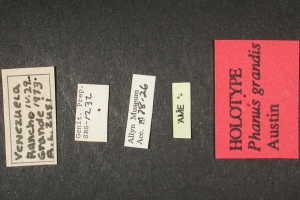 Austin (1993: 25): “Holotype ♂: with the following labels: white, black border, handprinted - Venezuela / Rancho IV. 29 / Grande 1973 / R. L. Zusi: white, printed and handprinted - Allyn Museum / Acc. 1978-26; white, printed and handprinted - Genit. Prep. / SRS - 1232: red, printed - HOLOTYPE / Phanus grandis / Austin.” — Paratypen: Je ein ♀ aus Panama und Kolumbien.
