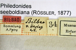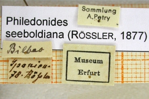 Auf der [wikipedia-Seite zu Philedonides seeboldiana (abgefragt 30. Juni 2023)] wird ohne Quellennennung behauptet: "The larvae feed on Ulex parviflorus". Auf [bladmineerders.nl (abgefragt 30. Juni 2023)] heißt es dazu: "host plants Fabaceae, monophagous Ulex parviflorus." Als Quelle dafür wird Corley et al. (2014) genannt. Bei Corley et al. (2014: 600) wird zu einem Falterfund berichtet: "M: Costa da Cabrita, flying in afternoon sunshine, 16-V-2013, Corley. Previously listed without data in Vives (1992). Spain. [Ulex parviflorus]." Die eckige Klammer um den Pflanzennamen soll hier tatsächlich auf eine Raupennahrungspflanze verweisen - doch konkrete Angaben fehlen auch hier. Schon Kennel (1910: 105) hatte notiert: "Der Schmetterling zeigt sich im Februar und März um Ulex parviflorus (nach Seebold)." - Ein Raupenfund an dieser Pflanze scheint noch immer auszustehen.