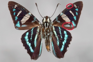 Typisch für diese Art ist der blaue Fleck auf der Unterseite der Vorderflügel. Ferner fehlt zumeist der Apicalfleck im Feld 9, was aber auch bei anderen Arten vorkommt. Die drei sehr ähnlichen Arten Phocides partia, Phocides padrona und Phocides pigmalion haben eine stachlige Tibia am mittleren Beinpaar, ein wichtiges gemeinsames Diagnosemerkmal im Gegensatz zu anderen ähnlichen Arten. (Autor: Ernst Brockmann)