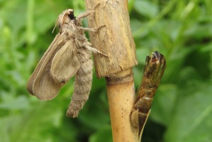 17-18: ♂ frisch geschlüpft neben Exuvie bzw. kurz nach dem Aushärten, Belgien, Sint-Gillis-Waas, 1 m, Raupe in Stängelbasis von Schilf (Phragmites australis) 8. April 2021, Fotos am 18. Juni 2021 (leg., cult., det. & Fotos: Ruben Meert)