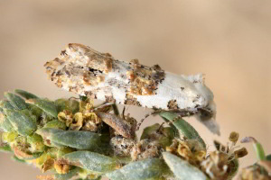 Elle vit dans les fruits de Anabasis aphylla L., à Gafsa, de l’A. articulata, à Biskra. Elle s’enferme dans un cocon ovoïde, fait d’un tissu léger, de soie blanchâtre, et fixé à une petite pierre, à la surface du sol, et se transforme après plusieurs mois d’attente."