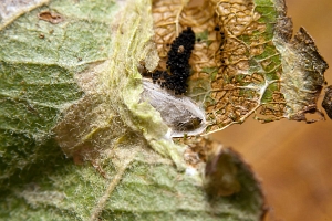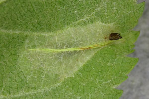 Anders die Angaben zum Nahrungspflanzenspektrum in Triberti (2007): er nennt im Text ausschließlich verschiedene Apfelbäume (Malus spp.), vgl. dazu folgenden [Beitrag im Lepiforum] und vermutet, dass bei Angaben zu anderen Pflanzen Fehlbestimmungen zugrunde liegen könnten. Auch auf [bladmineerders.nl] wird davon ausgegangen, dass Angaben, die nicht von Malus-Arten stammen, Ausnahmen sind oder auf Fehlbestimmungen beruhen. Andererseits gibt es in dem von Triberti (2007: ) untersuchten Material nicht nur ex-larva-Tiere von Malus sylvestris, Malus domestica, Malus lanifolia und Malus floribunda, sondern auch ein Tier, das Hartig laut Etikett in Italien aus Prunus padus gezüchtet hat. Im Lepiforum werden genitalüberprüfte Tiere von Deutschland von Pyrus communis und von Cydonia oblonga aus der Schweiz gezeigt (s.o.). Auch einzelne Literaturangaben von Mespilus germanica und Sorbus aria scheinen einer kritischen Prüfung standzuhalten. Fest steht aber, dass die allermeisten Minen tatsächlich an Malus spp. zu finden sind.