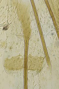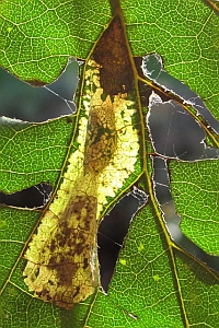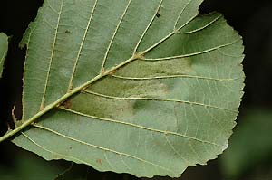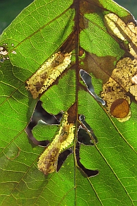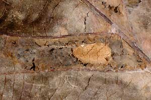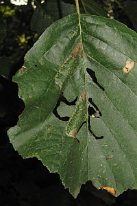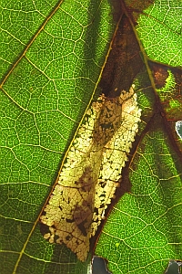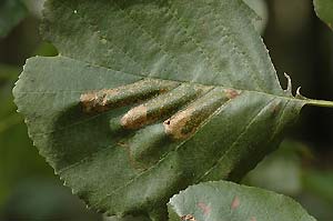 Mine: Fünf Minen von Ph. froelichiella (30 mm lang), eine von Ph. klemannella. Bei Kenntnis der Merkmale ist die Unterscheidung ganz leicht: Ph. froelichiella-Minen reichen ganz (!) in den Winkel zwischen Mittelrippe und Seitenader. Im mittleren Minen-Alter ist dort eine charakteristische roströtliche Verfärbung zu sehen, während das Blatt sonst noch grün ist. Auch die jungen Minen (Fotos s.o.) reichen schon ganz in den Aderwinkel, aber noch ohne die Verfärbung. Ph. klemannella-Minen reichen nie bis in den Winkel. Die eine klemannella-Mine ist rechts oben im Bild zu sehen. Manchmal stehen sie aber der Mittelrippe deutlich näher.