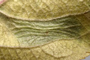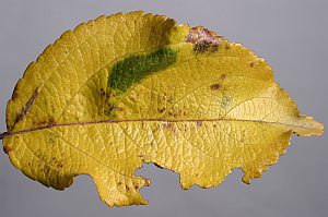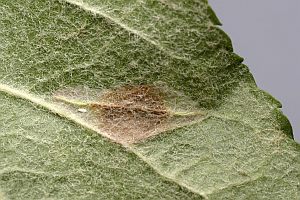 Anders die Angaben zum Nahrungspflanzenspektrum in Triberti (2007): er nennt im Text ausschließlich verschiedene Apfelbäume (Malus spp.), vgl. dazu folgenden [Beitrag im Lepiforum] und vermutet, dass bei Angaben zu anderen Pflanzen Fehlbestimmungen zugrunde liegen könnten. Auch auf [bladmineerders.nl] wird davon ausgegangen, dass Angaben, die nicht von Malus-Arten stammen, Ausnahmen sind oder auf Fehlbestimmungen beruhen. Andererseits gibt es in dem von Triberti (2007: ) untersuchten Material nicht nur ex-larva-Tiere von Malus sylvestris, Malus domestica, Malus lanifolia und Malus floribunda, sondern auch ein Tier, das Hartig laut Etikett in Italien aus Prunus padus gezüchtet hat. Im Lepiforum werden genitalüberprüfte Tiere von Deutschland von Pyrus communis und von Cydonia oblonga aus der Schweiz gezeigt (s.o.). Auch einzelne Literaturangaben von Mespilus germanica und Sorbus aria scheinen einer kritischen Prüfung standzuhalten. Fest steht aber, dass die allermeisten Minen tatsächlich an Malus spp. zu finden sind.