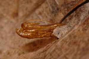 1: Exuvie, Schweiz, Bern, Ins, 432 m, 8. Oktober 2005, unterseitige Blattmine an Populus nigra pyramidalis, in Zimmertemperatur: 18. Januar 2006, e.l. 2. Februar 2006 (Foto: Rudolf Bryner), leg., cult. & det. Rudolf Bryner