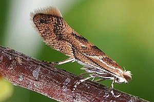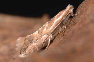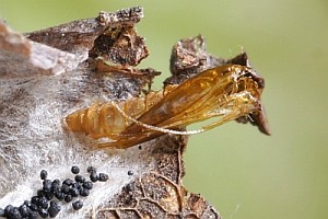 1: Exuvie, Schweiz, Bern, Ins, 432 m, 8. Oktober 2005, unterseitige Blattmine an Populus nigra pyramidalis, in Zimmertemperatur: 18. Januar 2006, e.l. 2. Februar 2006 (Foto: Rudolf Bryner), leg., cult. & det. Rudolf Bryner