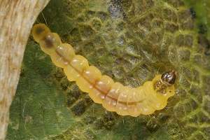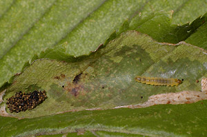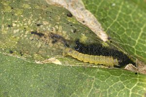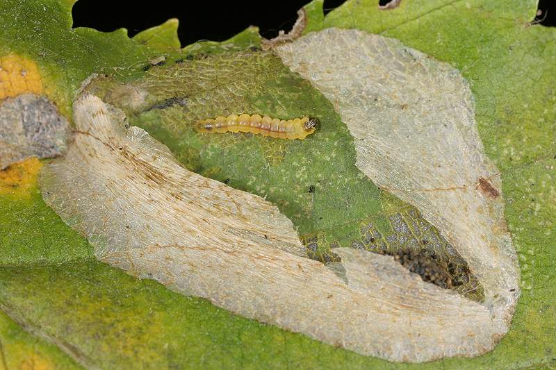 4: verpuppungsreife Raupe, Schweiz, Neuchâtel, Cressier, nordgerichteter Waldrand, 430 m, leg. 7. Oktober 2006 Minen an Carpinus betulus (Studiofoto: Rudolf Bryner), cult. & det. Rudolf Bryner