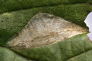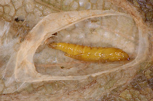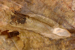 Puppe: Phyllonorycter esperella verpuppt sich im Herbst an einem Minen-Ende in einem zähen bräunlichweissen Kokon. Der Kot wird zuvor in einiger Entfernung vom Kokon in einem anderen Teil der Mine sorgfältig aufgehäuft. Die Puppe ist von gelbbrauner Färbung. (Autor: [Rudolf Bryner])