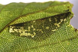 5-6: geöffnete Mine an Carpinus betulus und Raupe darin: Deutschland, Rheinland-Pfalz, Ober-Olmer Wald bei Mainz, 7. Oktober 2007 (manipulierte Freilandfotos: Jürgen Rodeland), det. Jürgen Rodeland