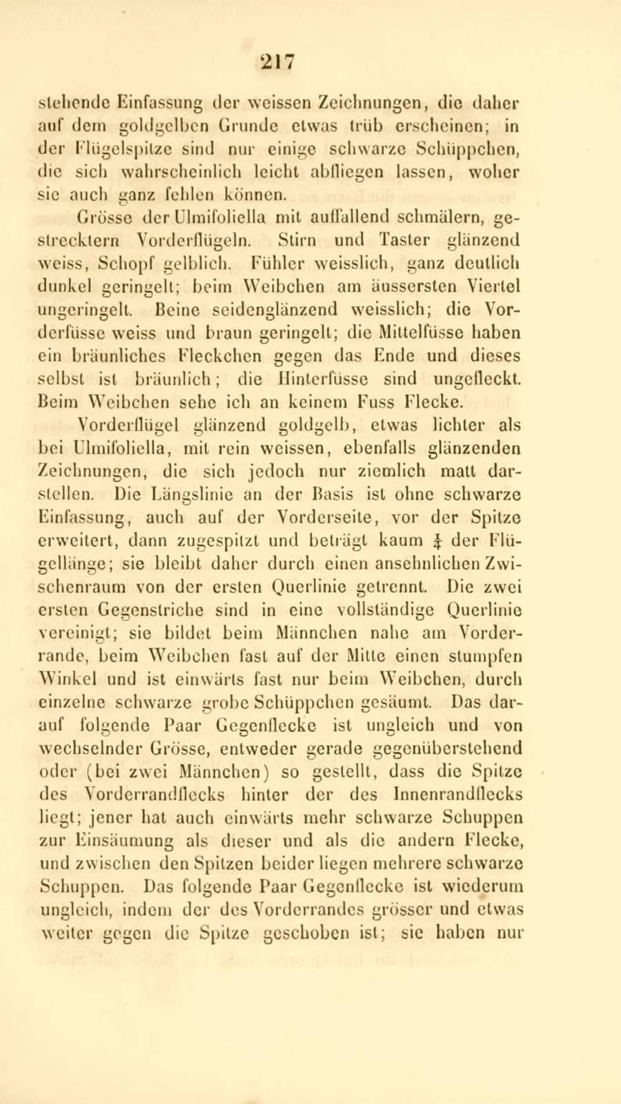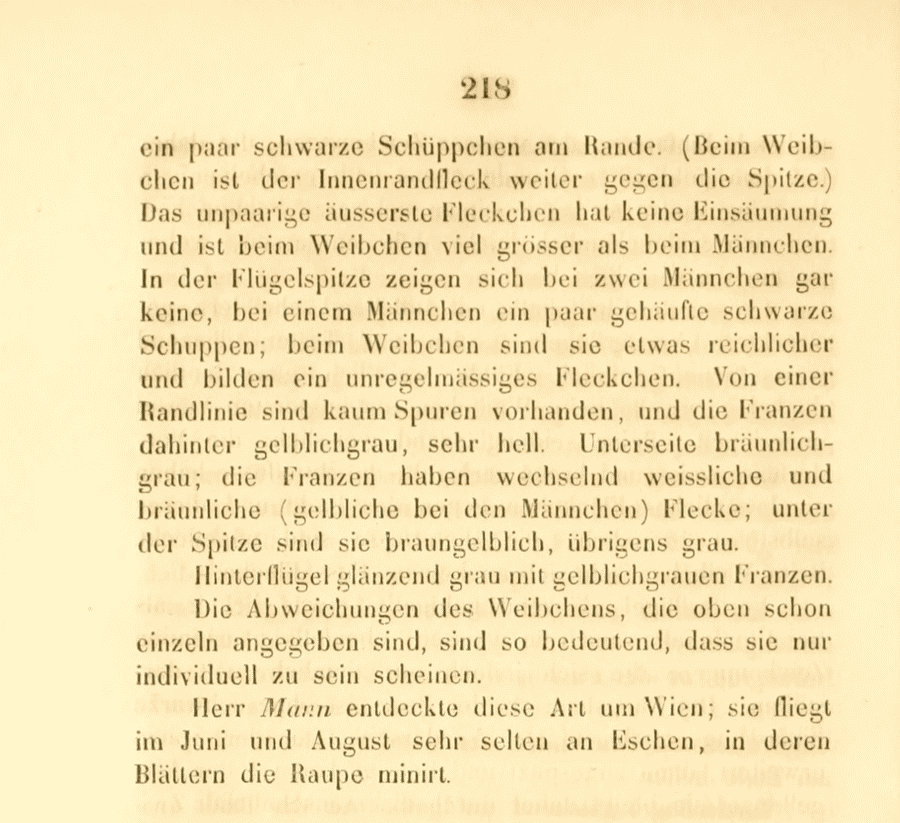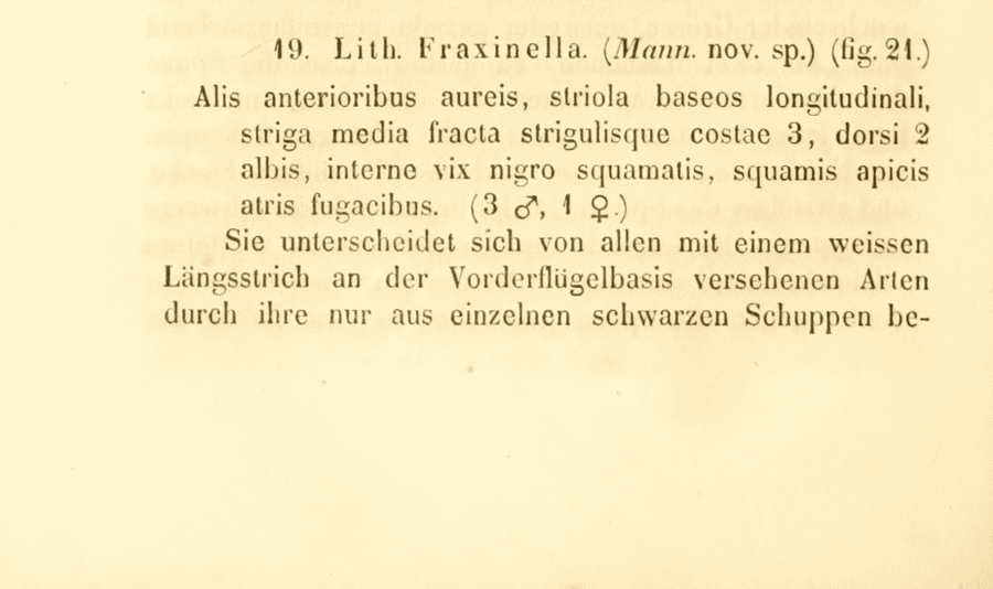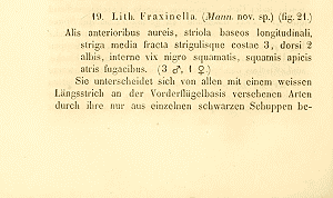 Das was Zeller (1846) beschreibt und abbildet ist eine Phyllonorycter-Art, und da gibt es keine einzige an der namengebenden Esche (Fraxinus). Die mitgeteilte Angabe zur Raupe kann also nicht stimmen: "... sie fliegt im Juni und August sehr selten an Eschen, in deren Blättern die Raupe minirt."