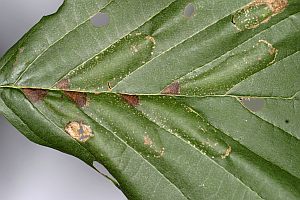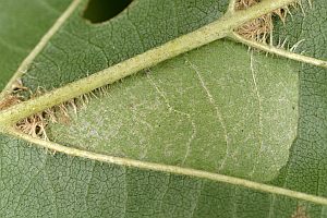 Mine: Fünf Minen von Ph. froelichiella (30 mm lang), eine von Ph. klemannella. Bei Kenntnis der Merkmale ist die Unterscheidung ganz leicht: Ph. froelichiella-Minen reichen ganz (!) in den Winkel zwischen Mittelrippe und Seitenader. Im mittleren Minen-Alter ist dort eine charakteristische roströtliche Verfärbung zu sehen, während das Blatt sonst noch grün ist. Auch die jungen Minen (Fotos s.o.) reichen schon ganz in den Aderwinkel, aber noch ohne die Verfärbung. Ph. klemannella-Minen reichen nie bis in den Winkel. Die eine klemannella-Mine ist rechts oben im Bild zu sehen. Manchmal stehen sie aber der Mittelrippe deutlich näher.
