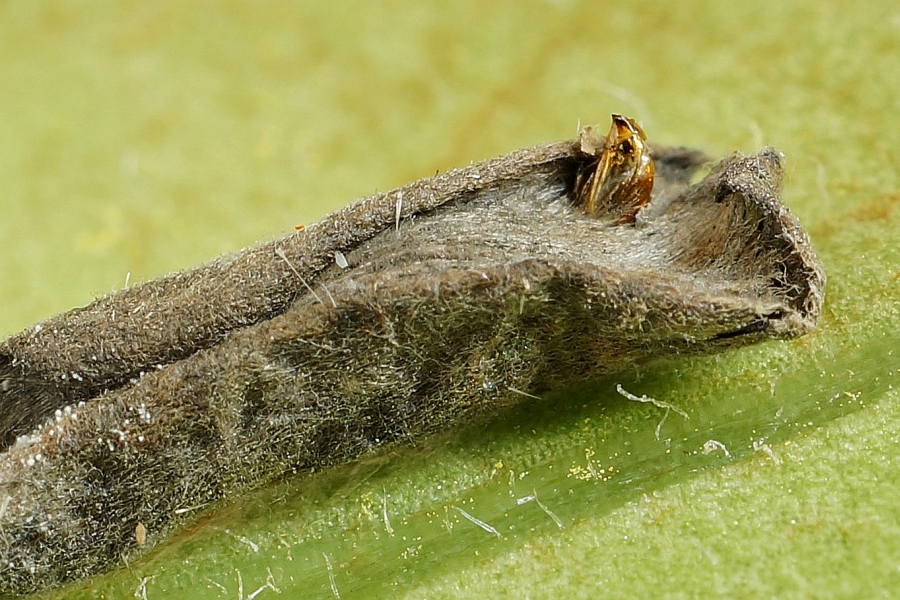 Die Minen sind unscheinbar und kaum von den anderen Blättern zu unterscheiden. Sie verursachen eine röllchenförmige Krümmung des Blattes nach unten.