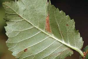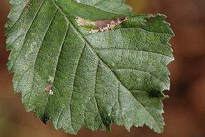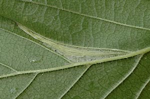 Mine: Im Schweizerischen Mittelland leben zwei Phyllonorycter-Arten an Ulme, Ph. schreberella und Ph. tristrigella. Beide bilden im Raupenstadium unterseitige Faltenminen an Ulmus glabra und U. minor. Die Minen von Ph. schreberella sind kurz und eiförmig, jene von Ph. tristrigella dagegen lang. (Autor: Rudolf Bryner)