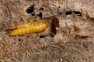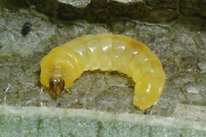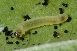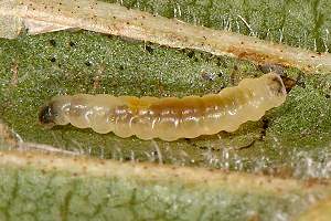 Raupe: Die Jungraupe ist durchscheinend weissgrün bis grün mit braunem Kopf. Später verliert die Raupe die grüne Färbung mehrheitlich und wird schmutzigweiss, um sich vor der Verpuppung schliesslich gelb zu verfärben. Auf dem Rücken scheint der dunkle Darmkanal vor allem auf den Segmenten 3-7 deutlich durch. Auf den Segmenten 8 und 9 fällt ein dunkel dottergelber Fleck, ein durchscheinendes Fettgewebe, auf. (Autor: Rudolf Bryner)