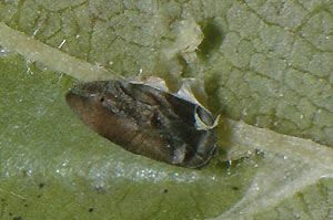 Puppe, Puppenkokon: Die Verpuppung erfolgt bei Ph. tristrigella vor der Überwinterung in einem dunkelbraun-grünlichen Kokon an einem Ende der Mine. Seine Gestalt ist tönnchenförmig, an der Schlupfseite etwas abgeflacht. Er ist an der blattseitigen Minenwand kräftig, an der Seite der Minenhaut nur lose angesponnen. Nach der Überwinterung ist das Ulmenblatt weitgehend verwittert. Der feste Kokon schützt die Puppe und liegt mehr oder weniger lose in der Bodenstreu. Auch Ph. schreberella verpuppt sich in einem Kokon, dieser ist aber länglich-eiförmig und von charakteristisch grünlichblauer Färbung, zudem ist er in der Mine allseitig nur lose befestigt. (Autor: Rudolf Bryner)