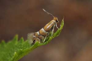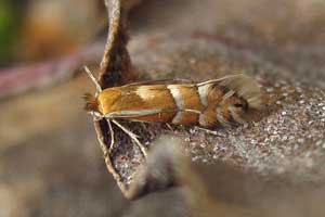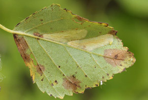 Die Art miniert unterseitig an Birkenarten (Betula pendula [= Betula alba] und B. pubescens) [Bradley, Jacobs & Tremewan (1970)]. Hinzu kommen einige als Parkbaum gepflanzte Birken-Arten. Herings (1957) Angabe, dass die Raupe gelegentlich auch an Ribes miniert, bedarf der Bestätigung. Angaben zu Ulmen (Ulmus glabra, Ulmus laevis) sind - trotz des Artnamens des Falters - falsch.