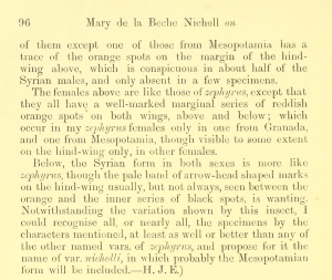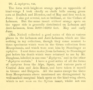 - Erstbeschreibung: De la Beche Nicholl, M. (1901): Butterflies of the Lebanon, with a Preface and Notes by Henry John Elwes, F.R.S., F.L.S., etc. — The Transactions of the Entomological Society of London for the Year 1901 (1): 75-97.