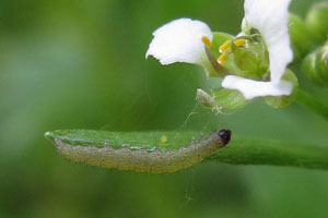 Die Art wird am häufigsten mit diversen Arten und Varietäten der Gattung Brassica in Verbindung gebracht, darüber hinaus aber ganz allgemein mit Brassicaceae. [Bladmineerders.nl (abgefragt 23. Oktober 2023)] nennt aber auch weitere Familien mit Senföl-Glycosiden, wie sie ja auch von den Pieris-Arten genutzt werden: "Brassicaceae, Capparaceae, Cleomaceae, Tropaeolaceae; narrowly polyphagous". Dort wird in alphabetischer Reihenfolge gelistet: "Aethionema arabicum; Alliaria petiolata; Alyssum; Arabidopsis; Arabis; Armoracia rusticana; Aubrieta deltoidea; Aurinia saxatilis; Barbarea vulgaris; Biscutella; Brassica napus, nigra, oleracea; Braya; Bunias; Cakile maritima; Capparis spinosa; Calepina; Camelina; Capsella; Cardamine; Cardaria; Cleome graveolens, spinosa; Cochlearia; Conringia orientalis; Crambe cordifolia, koktebelica, maritima; Diplotaxis; Eruca; Erucastrum; Erysimum cheiri; Hesperis matronalis; Hirschfeldia incana; Iberis; Isatis tinctoria; Lepidium sativum; Lobularia; Lunaria annua; Malcolmia littorea; Matthiola longipetala subsp. bicornis, odoratissima; Moricandia; Myagrum; Neslia; Peltaria; Raphanus raphanistrum, sativus; Reseda; Rorippa; Sinapis alba, arvensis; Sisymbrium supinum; Thlaspi; Tropaeolum." Und es wird betont: "Newman found a strong preference for Lepidium sativum."