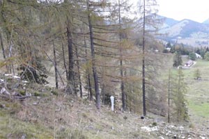 1: Lärchen (Larix decidua, die Nahrungspflanze der Raupe: Italien, Alpen, Südtirol, Obervinschgau, Sesvennagruppe, Watles oberhalb Prämajur, 1700 m, 13. Oktober 2007 (Foto: Axel Steiner)