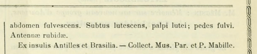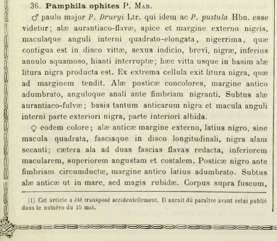 - Erstbeschreibung: Mabille, P. (1878): Descriptions de Lépidoptères nouveaux de la famille des Hespérides, (Suite) (1). — Petites nouvelles entomologiques 2 (197): 233-234. — Digitalisat auf biodiversitylibrary.org: [233]