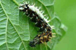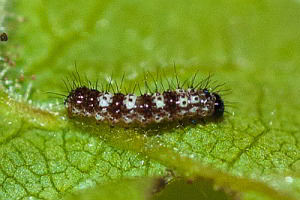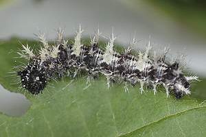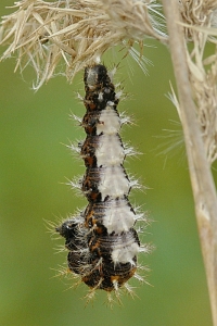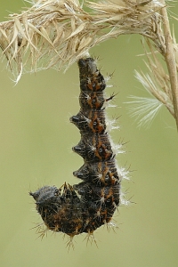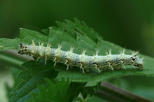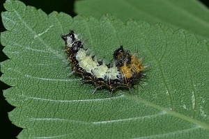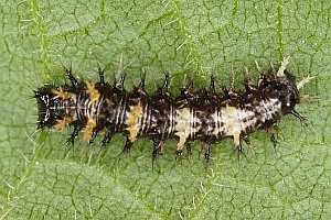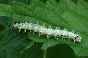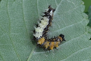 Die recht auffällig gefärbte Raupe lebt einzeln an Weide (Salix spp.), Ulme (Ulmus spp.), Johannisbeere (Ribes spp.), Hainbuche (Carpinus betulus), Hasel (Corylus spp.), Hopfen (Humulus lupulus) und vor allem Brennnesseln (Urtica spp.). Sie spinnt sich nicht ein, sondern lebt offen an der Nahrungspflanze, meist jedoch verborgen an der Blattunterseite. Jedoch werden vereinzelt auch verlassene Blatttüten der Admiralraupe (Vanessa atalanta) genutzt. Man findet sie von April bis September.