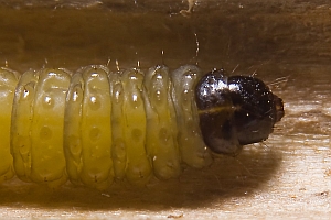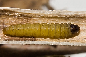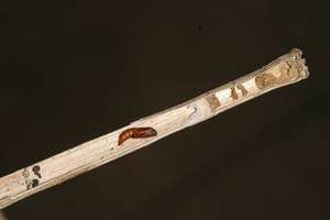 In den verschlossenen Stängeln von Echtem Springkraut (Impatiens noli-tangere) finden sich die erwachsenen Raupen. Sie haben ihren Wohnstängel oben mit einem dreifach angelegten Deckel verschlossen und werden jetzt nur noch das Schlupfloch anfertigen, bevor sie sich verpuppen.