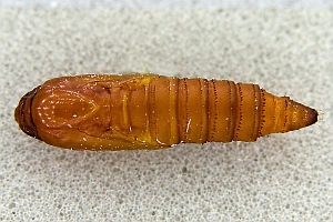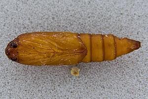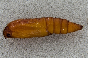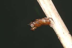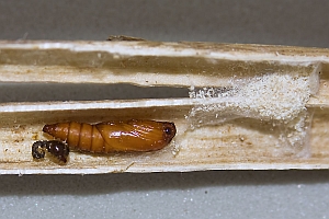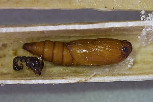 Die Verpuppung findet im Innern der letztjährigen Stängel statt. Dabei bewegen sich die Puppen frei zwischen einem feinen Gespinstabschluss mit abgestreifter Raupenhaut dicht oberhalb der Wurzel und dem drei- bis vierfach angelegten oberen Stängelverschluss unmittelbar unterhalb des ersten Stängelknotens. Die Puppen haben eine deutliche Spitze an der Front des Kopfes. Möglicherweise dient sie zur Öffnung des von der Raupe vorbereiteten Schlupflochs. Die Exuvien der geschlüpften Falter ragen seitlich aus den Stängeln heraus.
