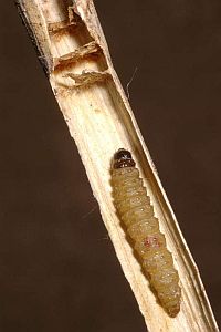 Die Raupen bewohnen immer nur das unterste Stängelglied zwischen Wurzel und unterstem Stängelknoten. [Rudolf Bryner]