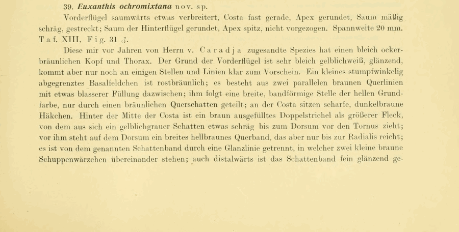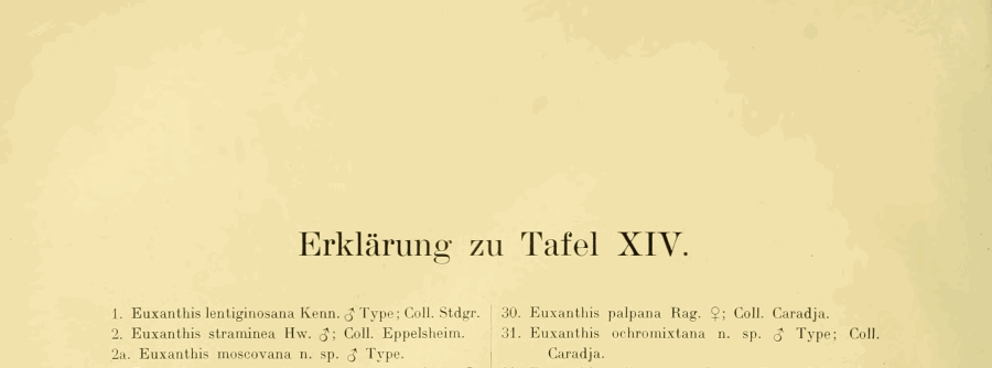 - Erstbeschreibung: Kennel, J. (1908-1921): Die Palaearktischen Tortriciden. Eine monographische Darstellung mit 24 Tafeln im Farbendruck, einer Stammtafel und mehreren Abbildungen im Text. — Zoologica 21 (54): 1-546, 729-742, Stammtafel, Taf. I-XXIV. Stuttgart.