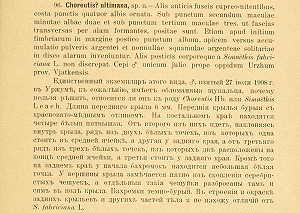 Das einzige Exemplar dieser Art, ein Männchen, wurde am 27. Juli 1908 in Urzhum gefunden. Bedauerlicherweise hat es abgebrochene Palpen, so dass man gar nicht entscheiden kann, ob es zu den Arten von Choreutis Hb. oder Simaethis Leach gehört. Die Länge des Vorderflügels beträgt 6 mm. Dieser Vorderflügel hat eine schwarzbraune, kupferrote Farbe. Auf dem vorderen Flügelrand befinden sich vier weiße Fleckchen. Vom zweiten Fleckchen sich vorbeugend zum Zentrum des Flügels geht eine Reihe von zwei weißen Fleckchen, eins davon steht in der mittleren Zelle, und das andere neben dem Hinterrand. Von der dritten Reihe, die aus drei weißen Fleckchen besteht, befinden sich zwei Fleckchen am Ende der mittleren Zelle, und das dritte steht am Hinterrand. Außerdem gibt es ein nicht besonders großes, weißes Fleckchen am Hinterrand am Anfang der Fransen. An der Flügelspitze kann man einen Fleck bemerken, der aus einer Anhäufung von kleinen, silbernen Schuppen besteht. Die einzelnen dieser Schuppen sind auf der Fläche der Hälfte des Flügels hin und her zerstreut. Die Fransen sind dunkel schwarzbraun. In der Färbung der Hinterflügel und der anderen Körperteile finde ich keine Unterschide zwischen diesem und Exemplaren von S. fabriciana L. (Übersetzung: Katja Nochvina, vermittelt von Ursula Beutler)
