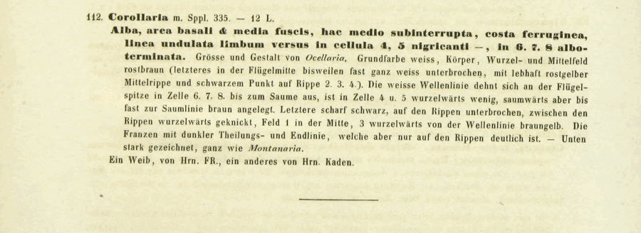 - Erstbeschreibung: Herrich-Schäffer, G. A. W. („1847“) [1843-1855]: Systematische Bearbeitung der Schmetterlinge von Europa, zugleich als Text, Revision und Supplement zu Jakob Hübner's Sammlung europäischer Schmetterlinge. Dritter Band. Die Spanner: 1-184, Index 1-34, pl. 1-90. Regensburg (G. J. Manz).