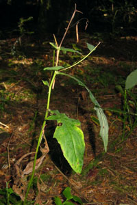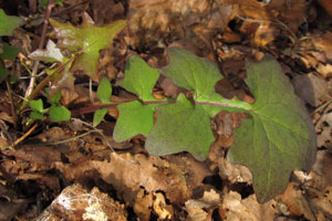 1: Endfieder vom Mauerlattich (Mycelis muralis) hängt welk herunter: Deutschland, Niedersachsen, Region Hannover, Ahltener Wald (primär Buchenhochwald), Nähe Ahlten, 80 m, 23. April 2017 (Foto: Tina Schulz)Forum