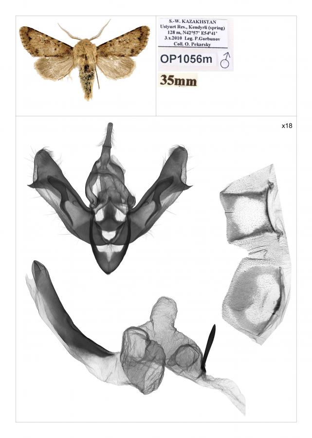 1: ♂ Paratypus: Kasachstan, Ustyurt Res., Kendyrli (spring), 128 m, N42°57’, E54°41’, leg. P. Gorbunov, 3. Oktober 2010 (coll., gen. prep, det. & fot.: Oleg Pekarsky), slide OP1056mForum