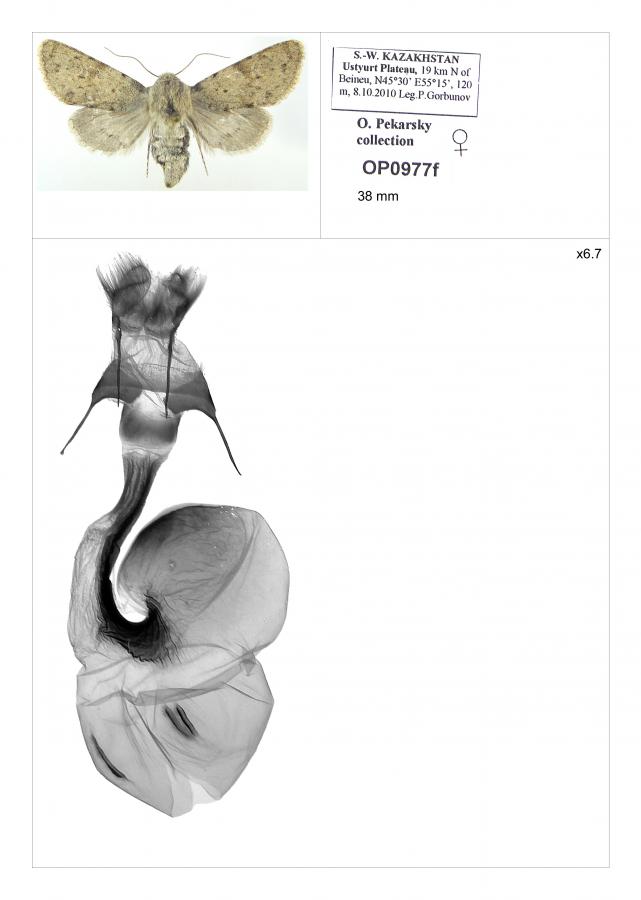 1: ♀ Paratypus: Kasachstan, Ustyurt Plateau, 19 km N of Beineu, 120 m, N45°30’, E55°15’, leg. P. Gorbunov, 8. Oktober 2010 (coll., gen. prep, det. & fot.: Oleg Pekarsky), slide OP0977fForum