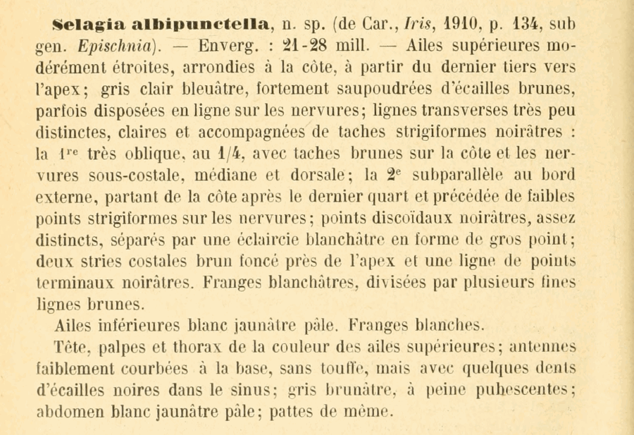 - Selagia albipunctella Chrétien, 1911 [Originalkombination und übliche Kombination bis Leraut (2014)]