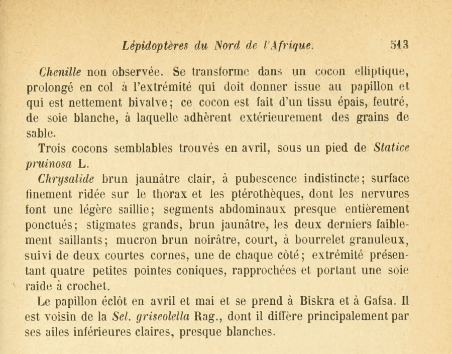 - Erstbeschreibung: Chrétien, P. (1911): Contribution à la connaissance des lépidoptères du nord de l'Afrique. — Annales de la Société entomologique de France 79: 497-531. Paris.