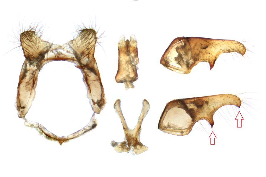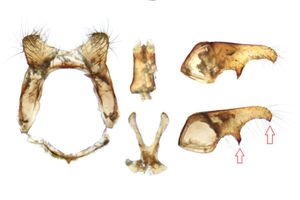 Eine eindeutige Unterscheidung von P. baton zu Pseudophilotes vicrama ist nur durch Genitaluntersuchung möglich. Sicherstes Merkmal sind die zwei Dornenfortsätze an der Valve (Pfeile). Bei P. vicrama nur ein Fortsatz [Forumsbeitrag STefan Kirchweger].