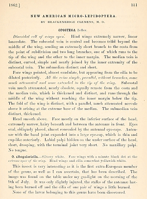 - Erstbeschreibung: Clemens, B. (1862): New American Micro-Lepidoptera. — Proceedings of the Entomological Society of Philadelphia 1 (5): 131-137. [Digitalisat auf biodiversitylibrary.org]