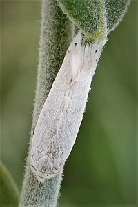 Noch unbekannt! Regier et al. (2015: 692) schreiben aber zum Falter: "Pseudopostega chalcopepla Walsingham is associated with Rosmarinus L. (van Nieukerken et al., 2004a)." Bei van Nieukerken et al. (2004) wird erläutert, wie es zu diesem Verdacht kam: "Staudinger named this species with the manuscript name ‘rosmarinella’, suggesting that Rosmarinus may be the host. Judging from the localities and the fact that other European species also feed on Lamiaceae (van Nieukerken, 1990a: Lycopus and Mentha), it is certainly a possible candidate as hostplant."