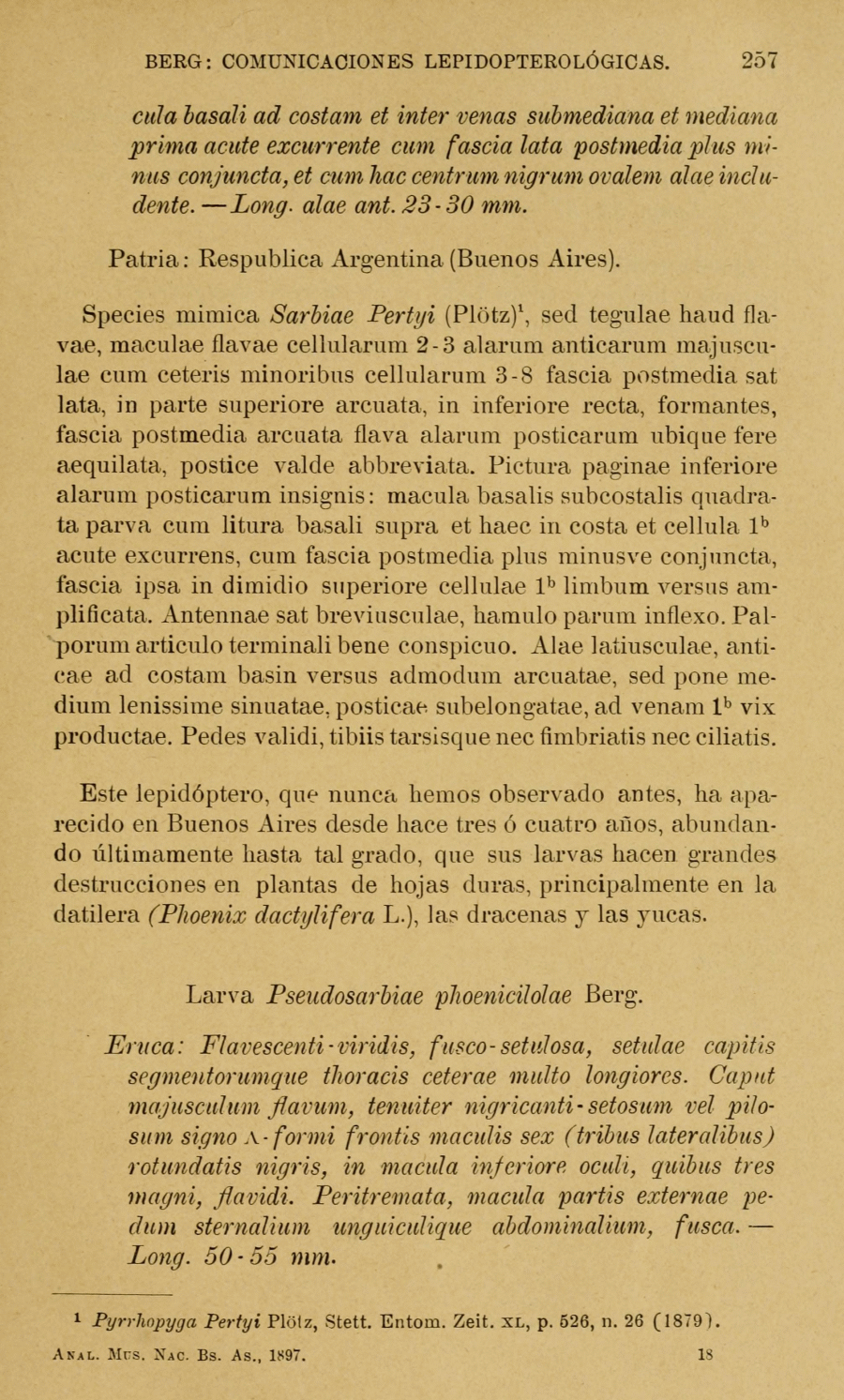 - Erstbeschreibung: Berg, C. (1897): Comunicaciones lepidopterológicas. Acerca de vienttivinvo Ropalóceros Sudamericanos. — Anales del Museo Nacional de Buenos Aires. Segunda serie 1: 233-258. — Digitalisat auf biodiversitylibrary.org: [256]