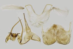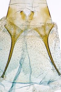 1: Genitalpräparat des als Lebendfalterbild 8 abgebildeten ♂, Österreich, Steiermark, Graz, St. Peter, ca. 380 m, Garten, Mischwaldrand, am Licht, 24. Juni 2017 (Präparation & Foto: Horst Pichler), det. Tina Schulz und [Genitalpräparat neu fotografiert]Forum