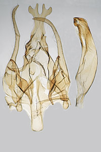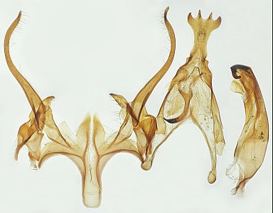 Anmerkung von Peter Buchner: Präparat 2 zeigt die für P. gibbosella typische Ausbildung des Uncus. Dagegen gibt es bei der Feststellung der Mikrodornen ein Problem: Huemer & Karsholt (1999) schreiben hierzu auch, dass sie gelegentlich schwer sichtbar sind. Das kann ich anhand dieses Präparates nur bestätigen: Selbst im Mikroskop bei 100 facher Vergrößerung fand ich nur 2 solcher Mikrodornen (am Foto praktisch unsichtbar), die anderen dunklen Fleckchen stellten sich als Verunreinigung heraus.